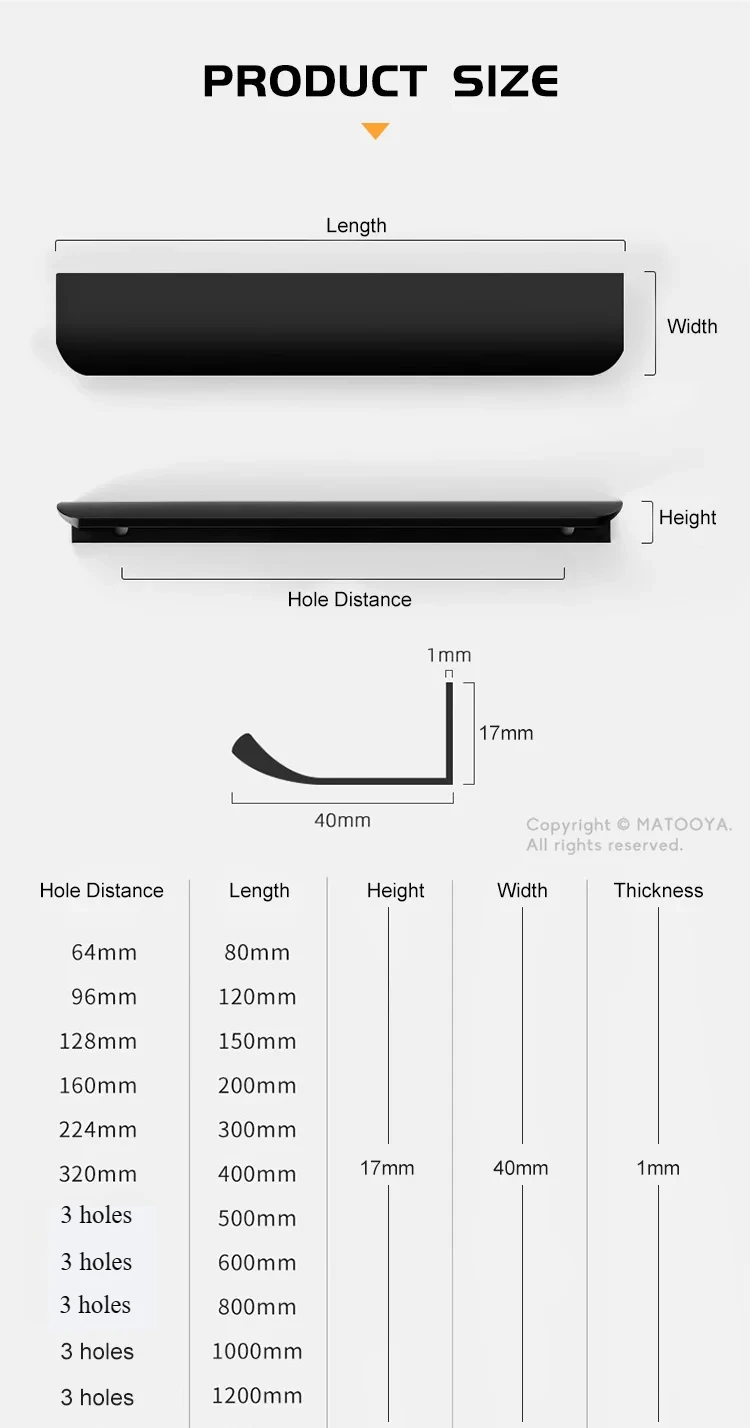 Dolap ve çekmece gizli kulpları renk ve boyut seçenekleri.